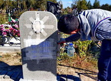 Замываем брусчатку и снимаем с надгробья защищающий надпись и фотокерамику скотч, протираем памятник от строительной пыли.