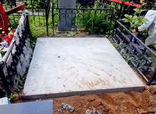 Первым делом мы демонтируем памятник, цветник, снимаем оградку, разламываем прилегающую к дорожке бетонную полосу. Затем выставляем опалубку по периметру участка.